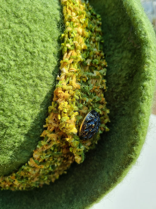 Filzhut in Moosgrün mit 2 Bändern, handgestrickt, Gr. 58/59