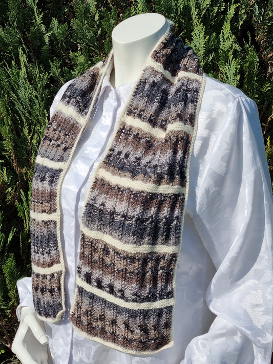 Schal aus feiner Sockenwolle grau-braun-offwhite, handgestrickt