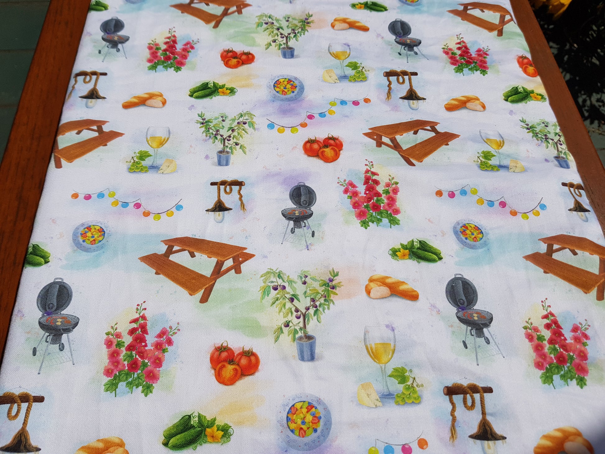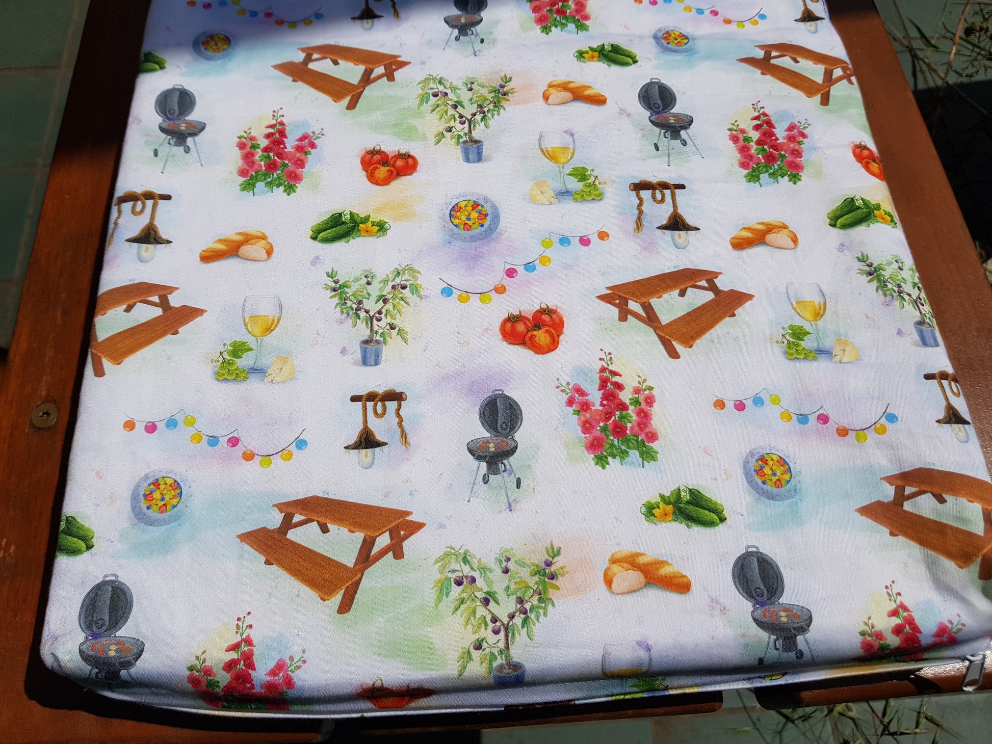 Bankauflage, Sitzpolster, Sitzkissen, 147 x 30 x 4 cm, Bio-Baumwolle, 140 g / qm, Satin, Grillparty-Muster