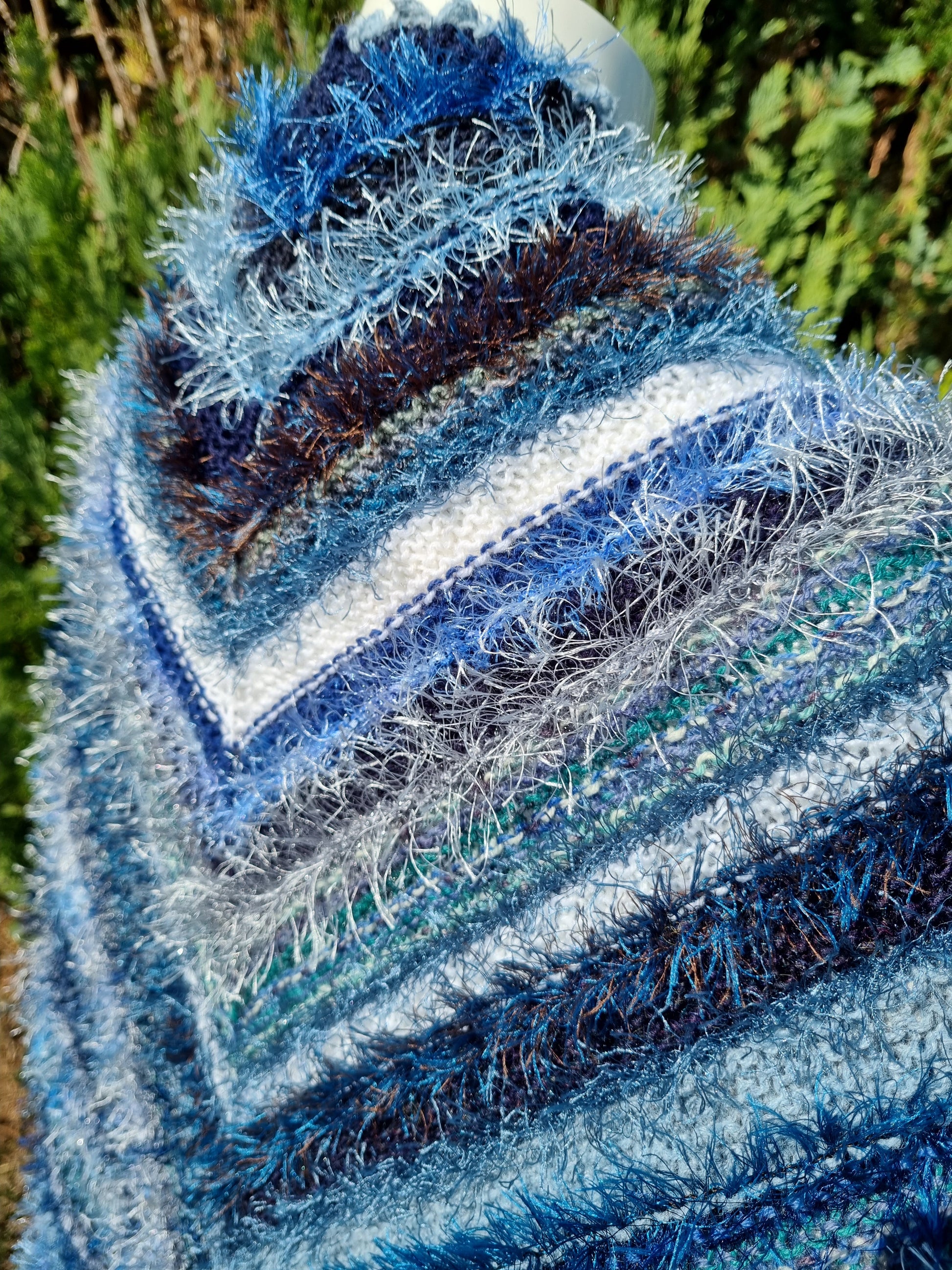 Großes Dreiecks-Schultertuch, handgestrickt in Hildesheim, Qualitäts-Sockengarne und Effektgarne; Blautöne und Weiß;