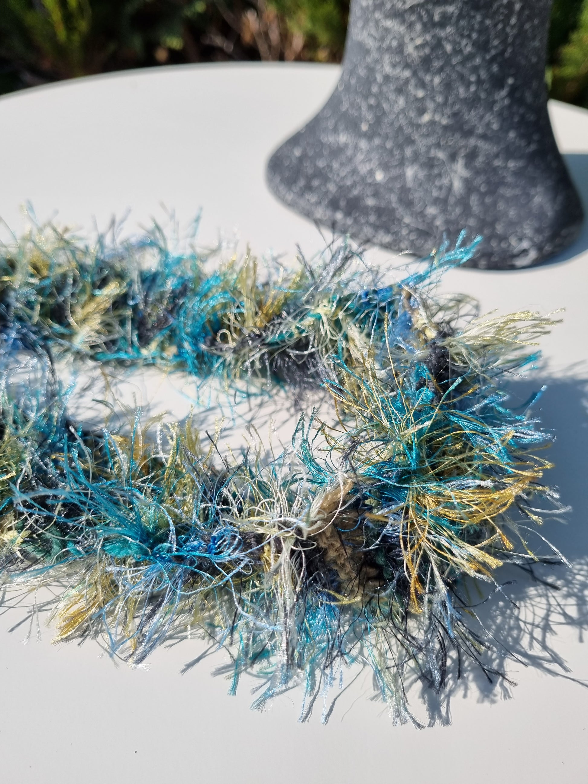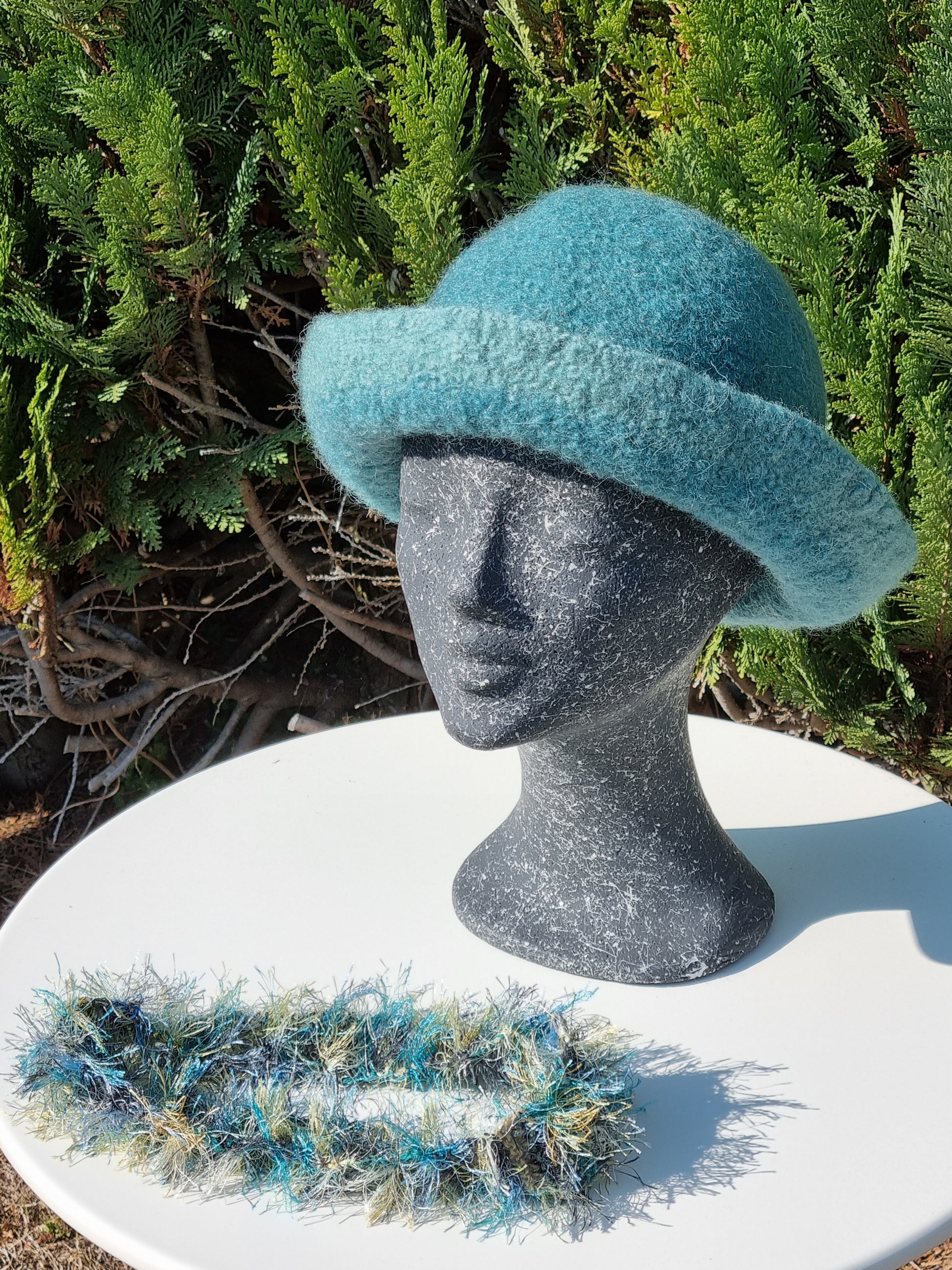 Handgestrickter, waschmaschinengefilzter Hut aus Qualitäts-Filzwolle in Schilfgrün/Seegrün mit abnehmbarem Band aus Effektgarn mit Farbverlauf grün-gelb-grau.
