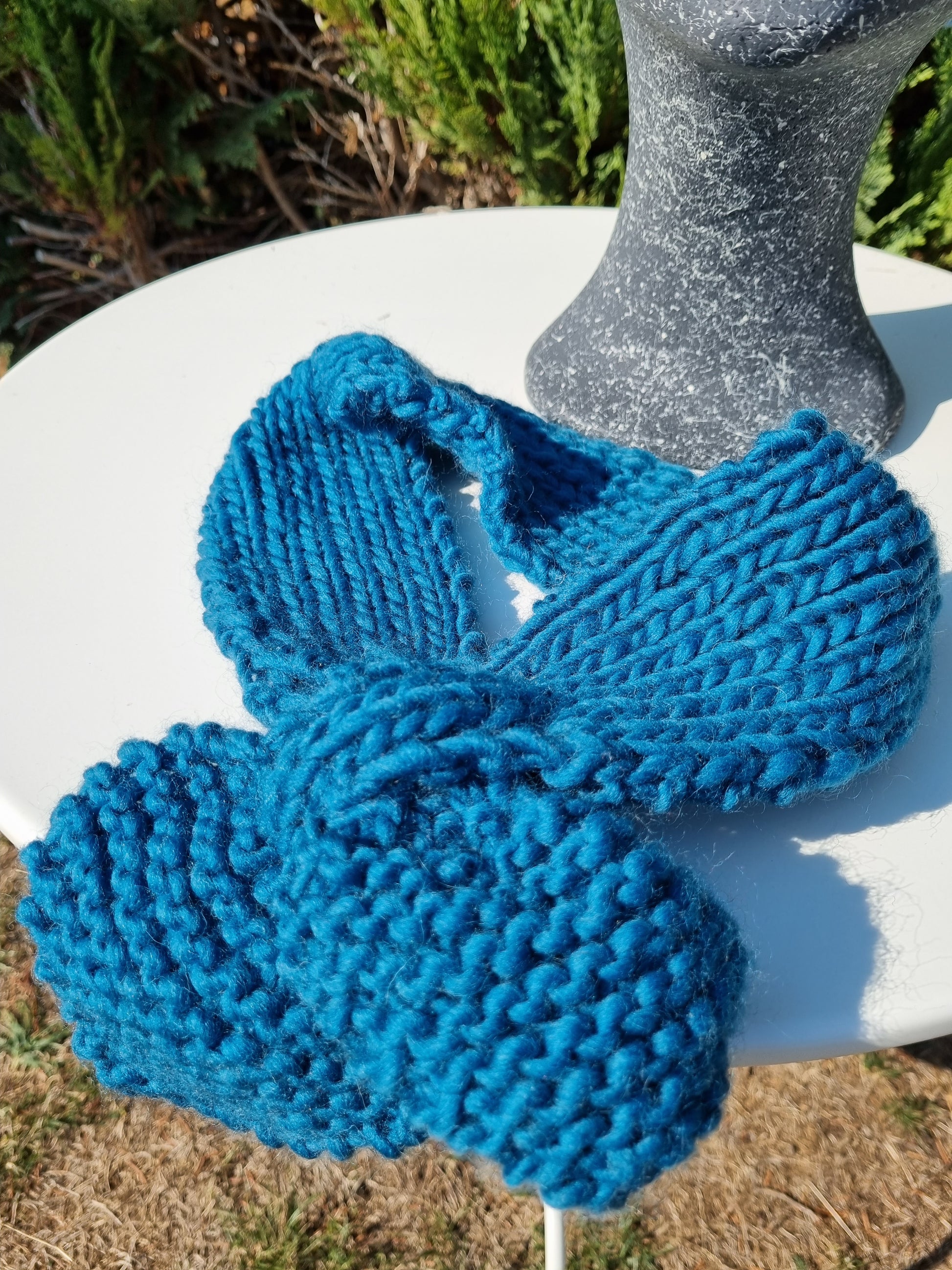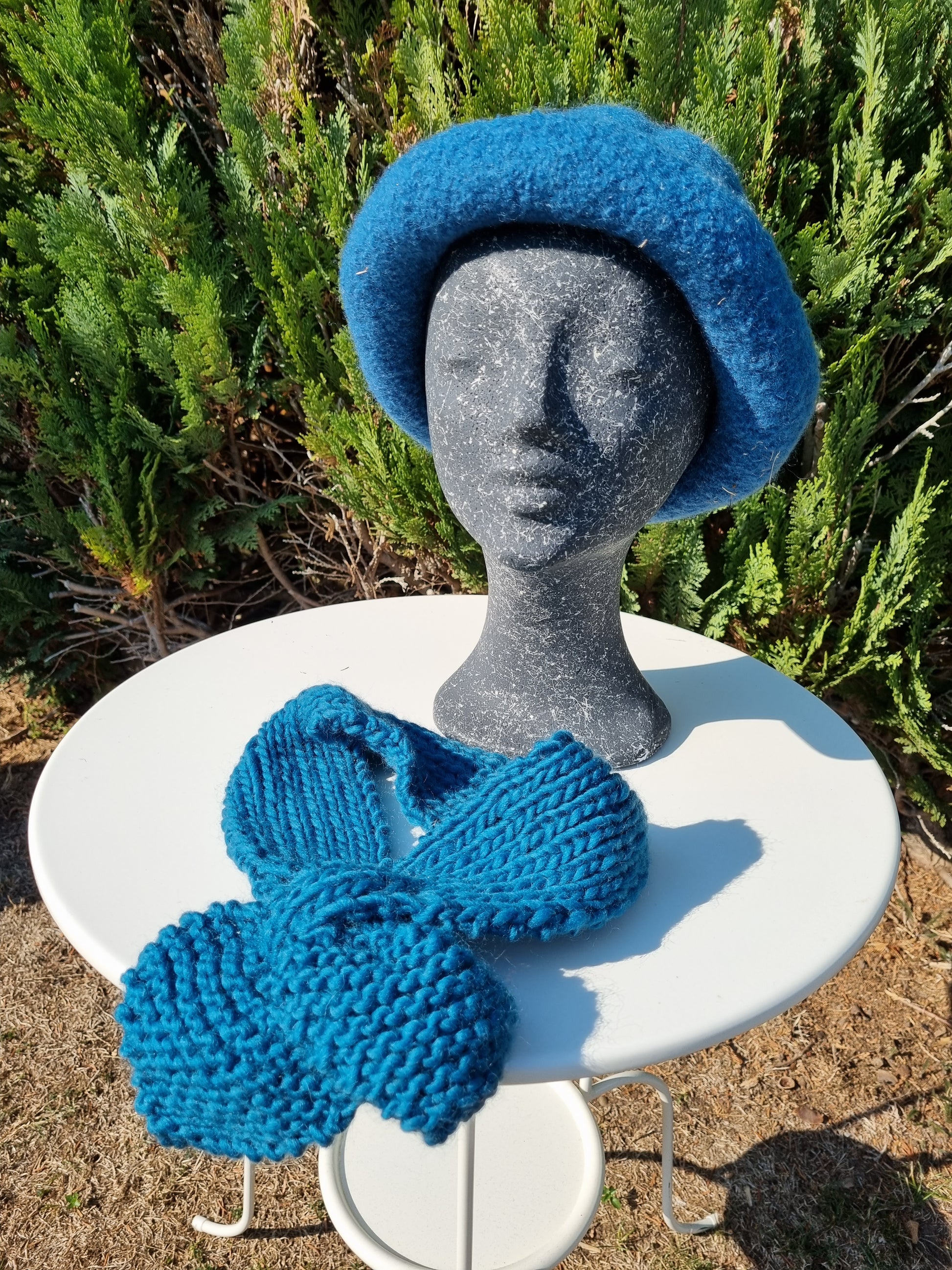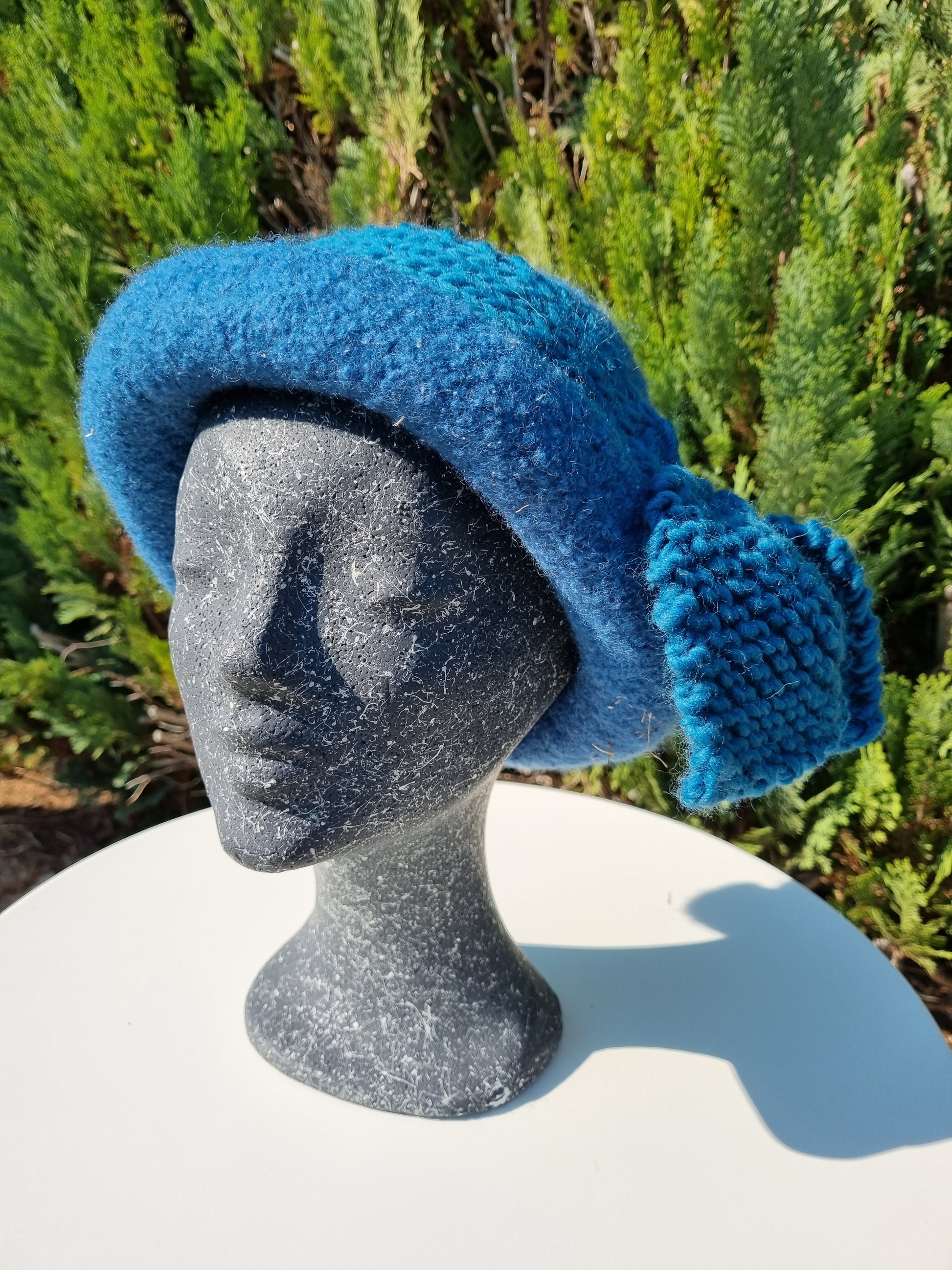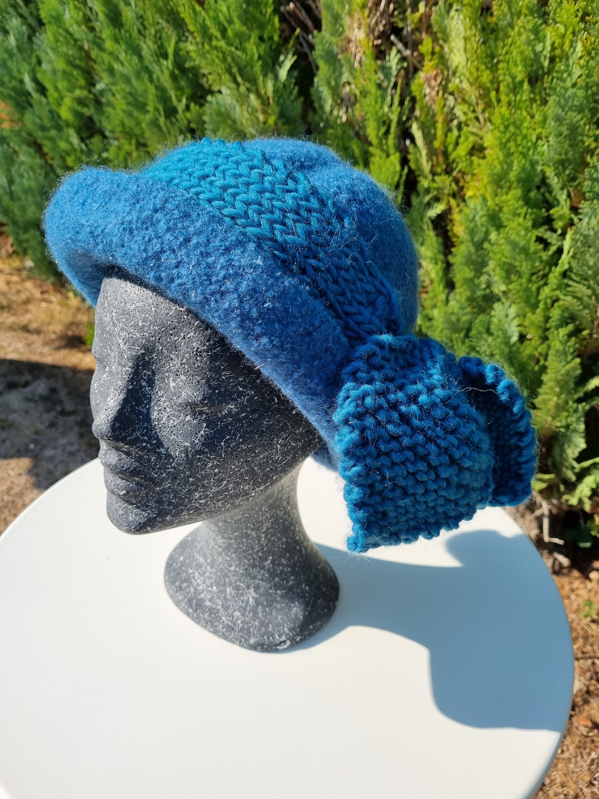 Handgestrickter, waschmaschinen-gefilzter Hut aus Qualitäts-Filzwolle mit abnehmbarem Schlaufen-Hutband aus der gleichen Wolle in ungefilztem Zustand, Farbe Petrol. Der Hut kann natürlich auch ohne Band getragen werden.