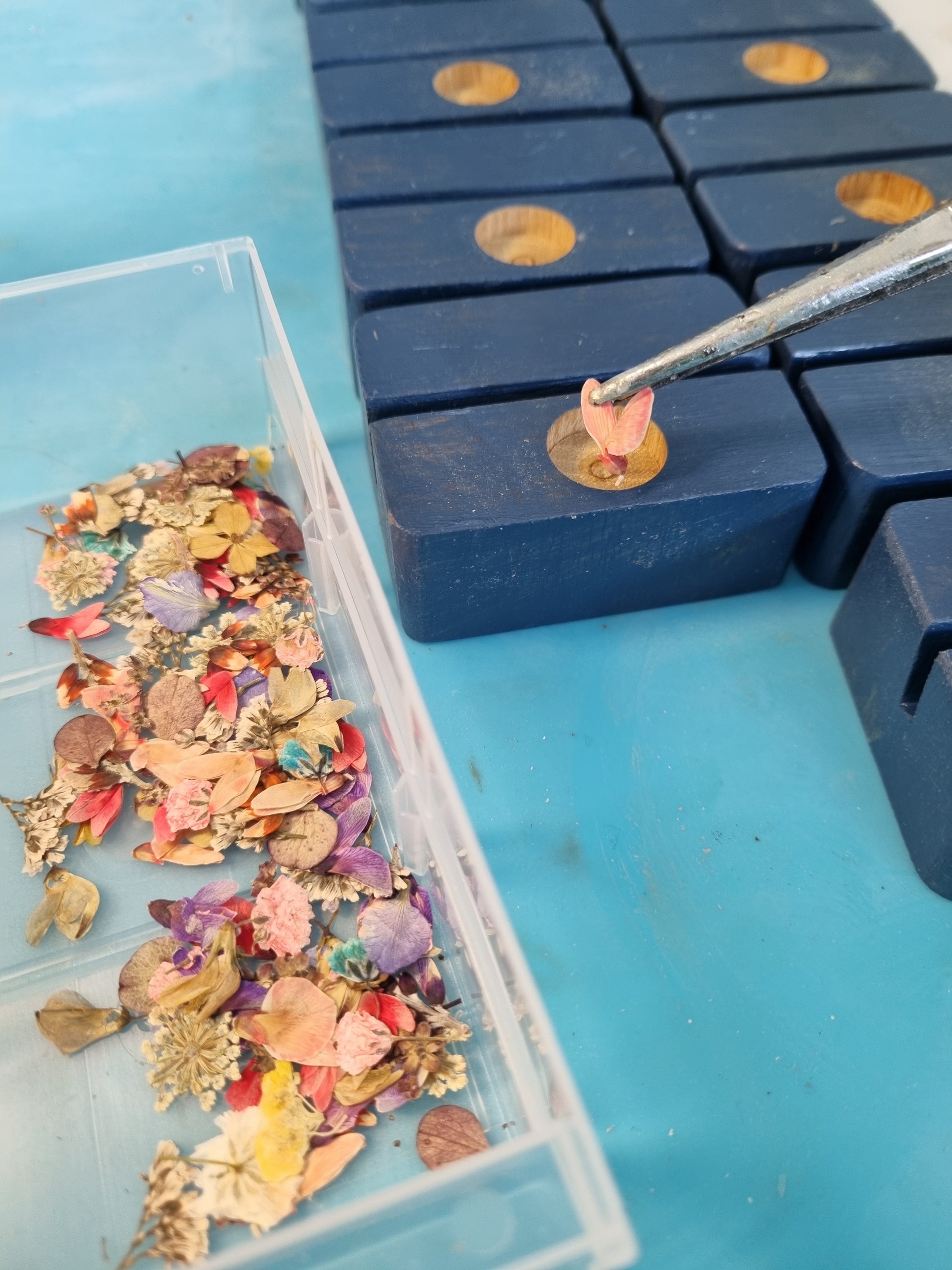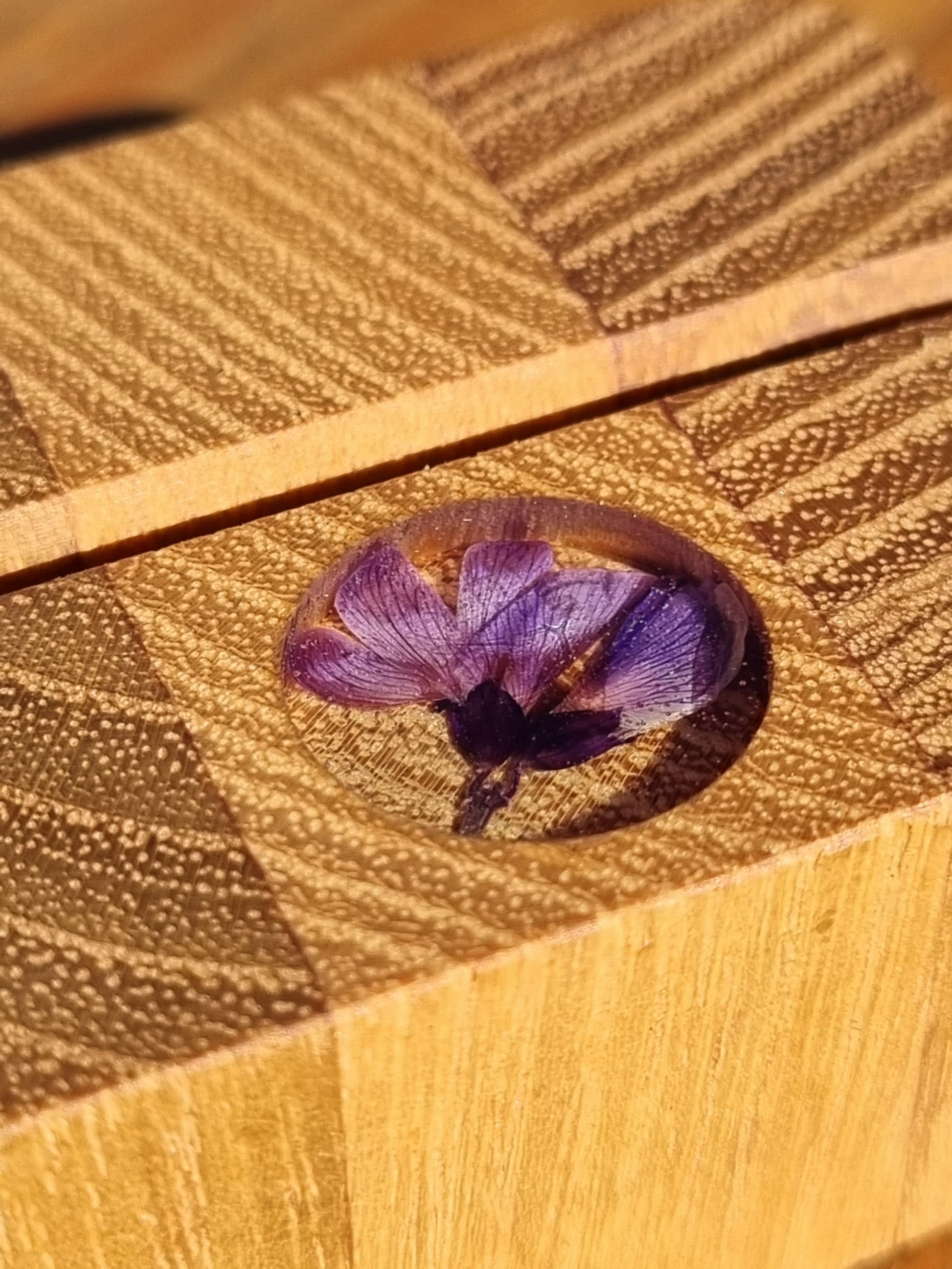 - Epoxi-Blüte: In einem kleinen mit Epoxidharz ausgegossenen "Fenster" befindet sich jeweils eine kleine, gepresste und getrocknete Überraschungsblüte.