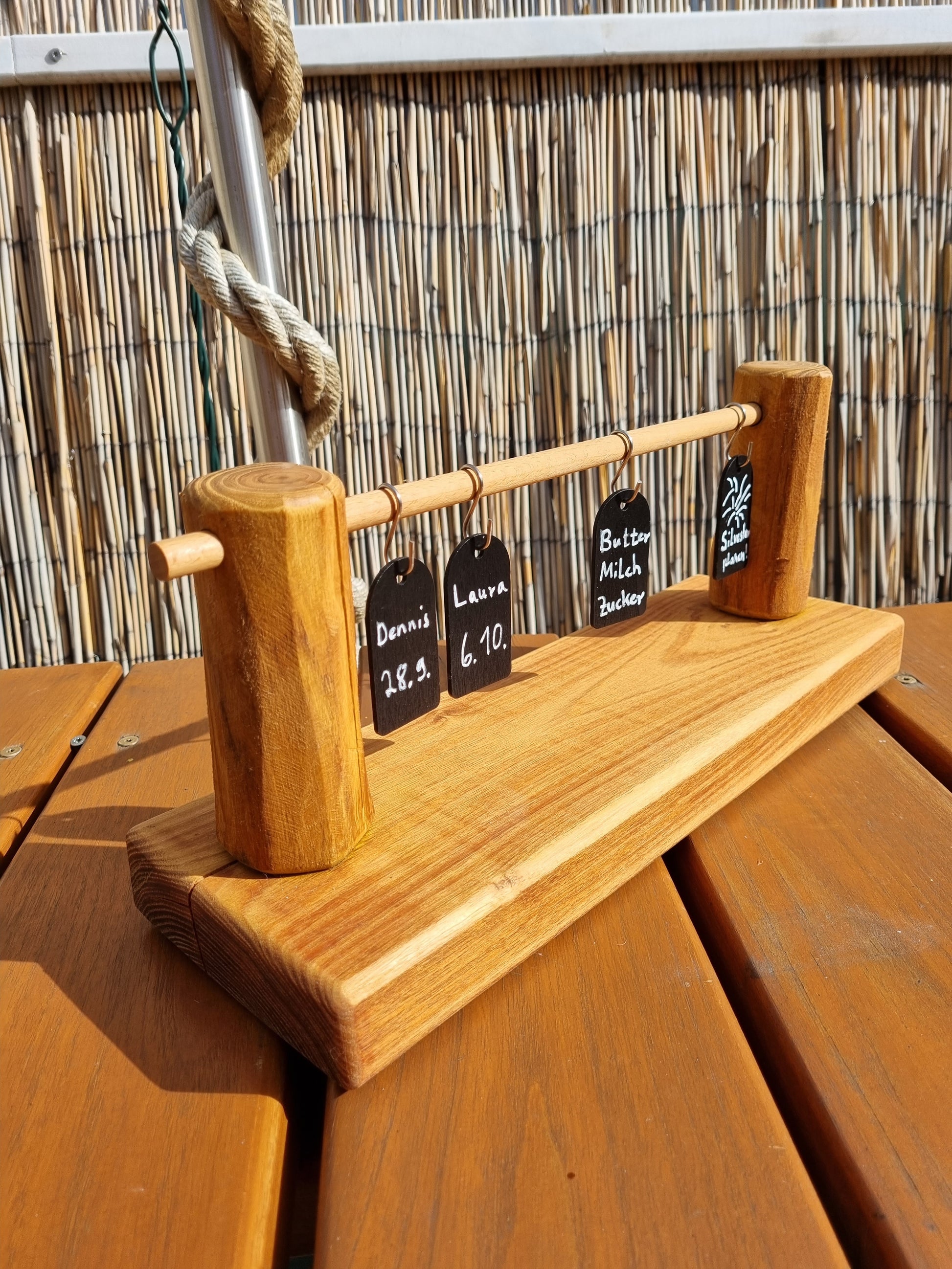 "Notizbrett" aus massiver Robinie (Querstab Buche), mit 10 Haken & 10 Holztafeln, geölt, Unikat