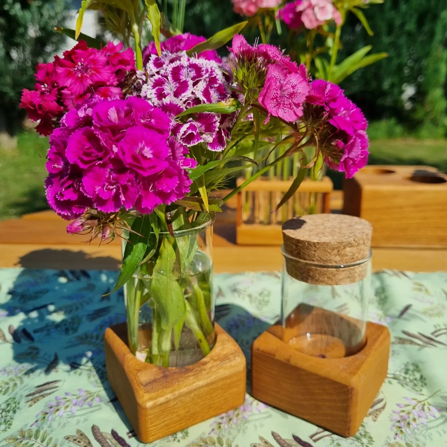 Angeboten werden verschiedene handgefertigte Varianten von Reagenzglasvasen aus Robinien-Massivholz. Geeignet, um z. B. Gewürze aufzubewahren.