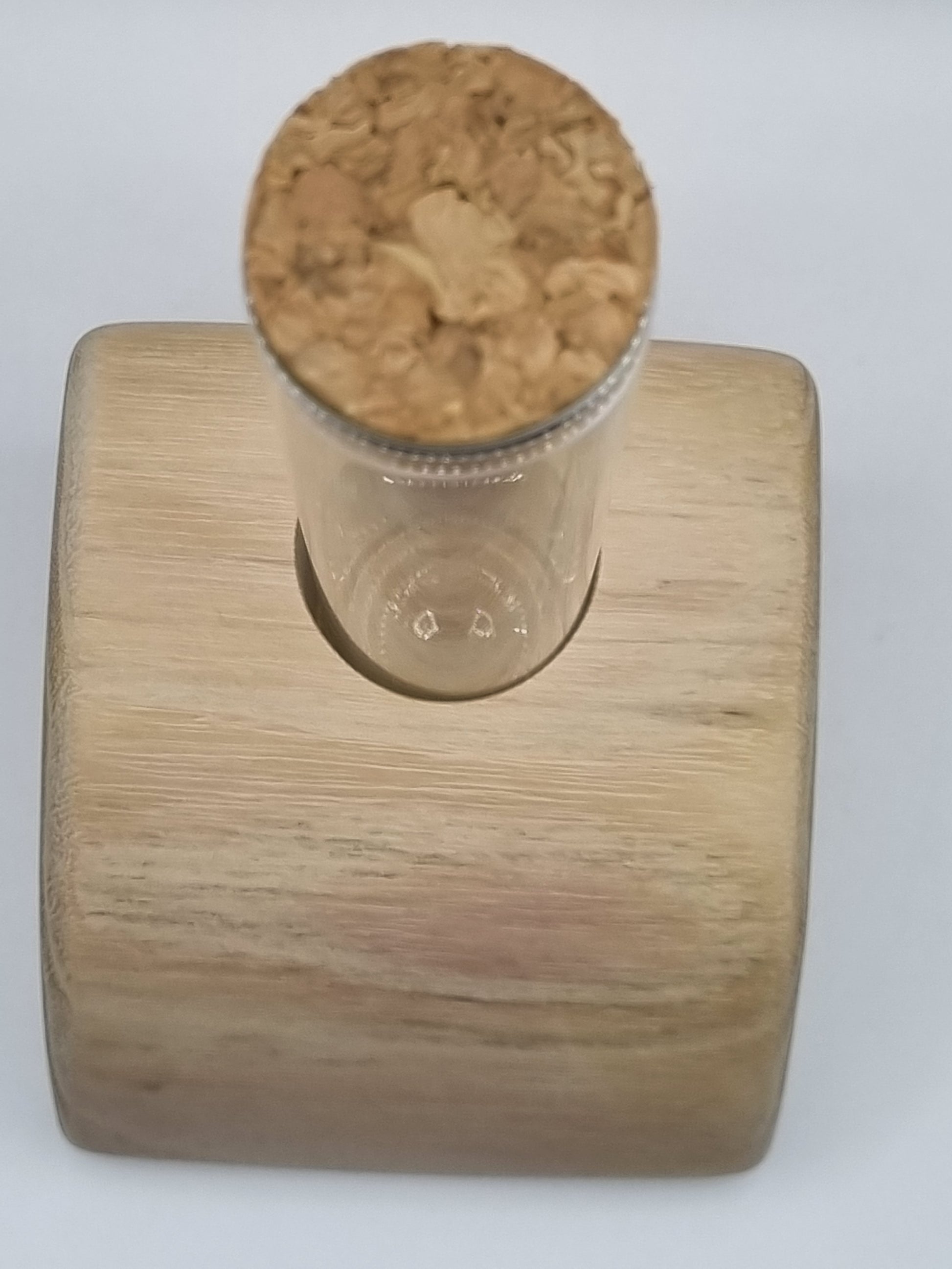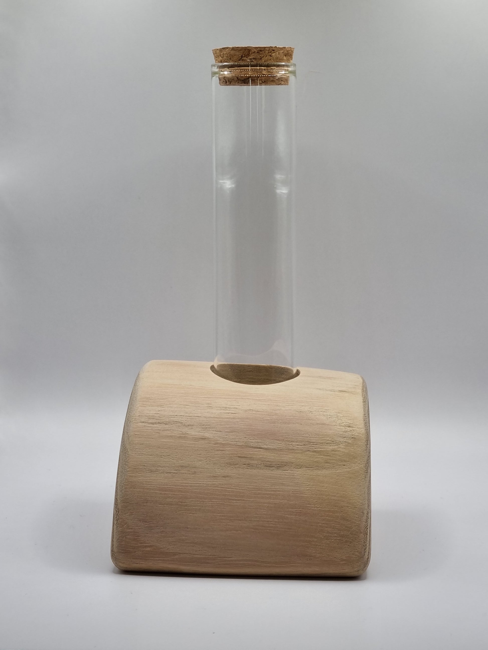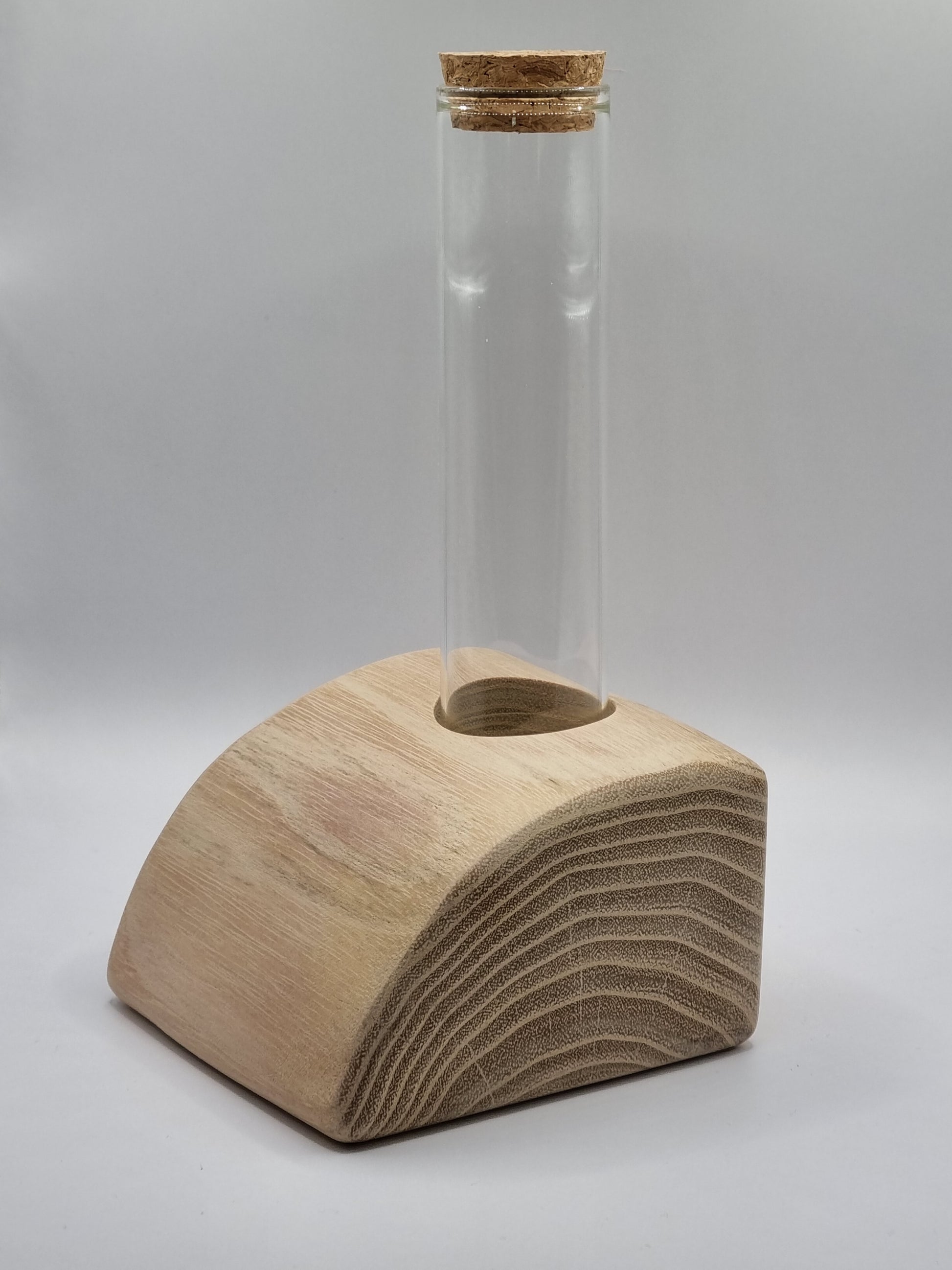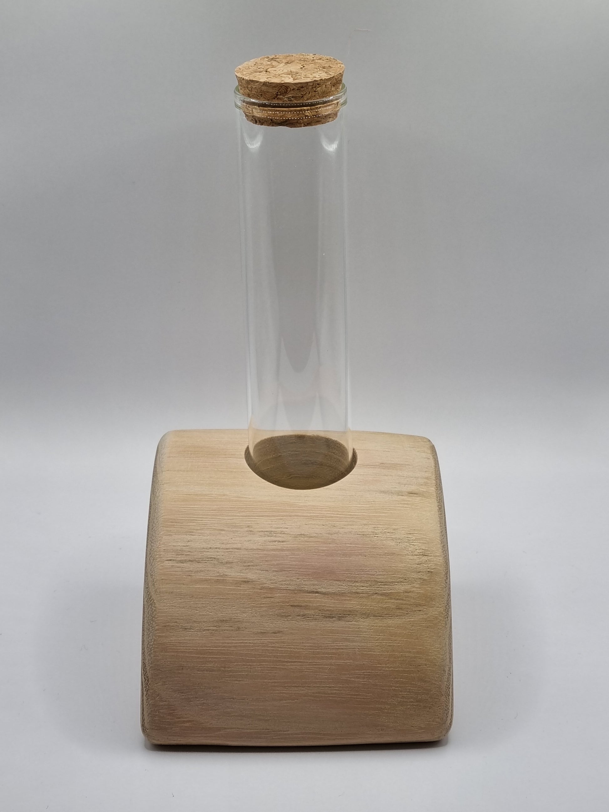 Geliefert wird genau das auf den Fotos zu sehende Unikat inkl. entsprechendem Reagenzglas mit Korken. Die Grundplatte wurde aus einem Robinienstamm ausgearbeitet und ist bei Frontansicht leicht schräg, das Glas jedoch gerade (s. Fotos).