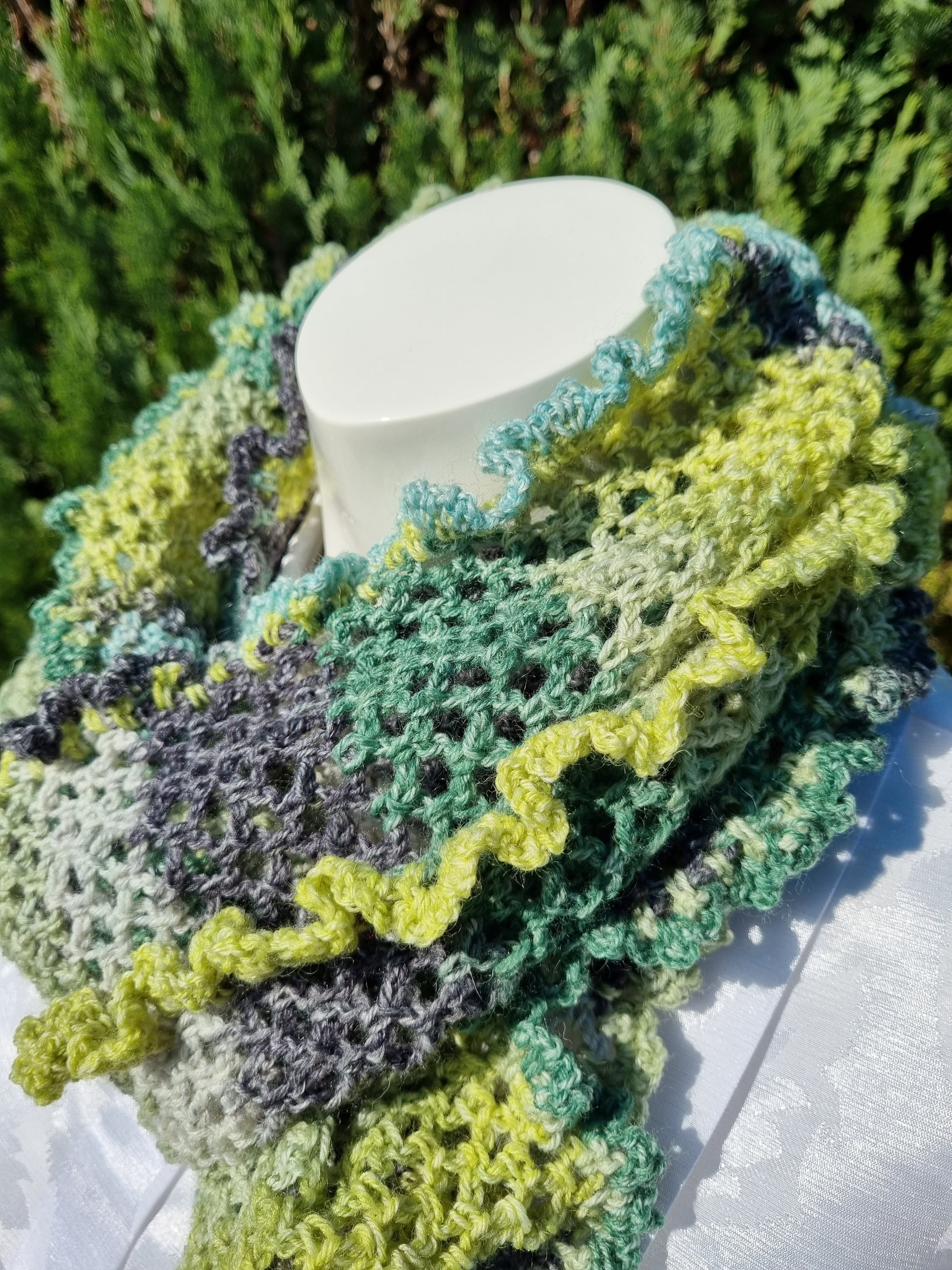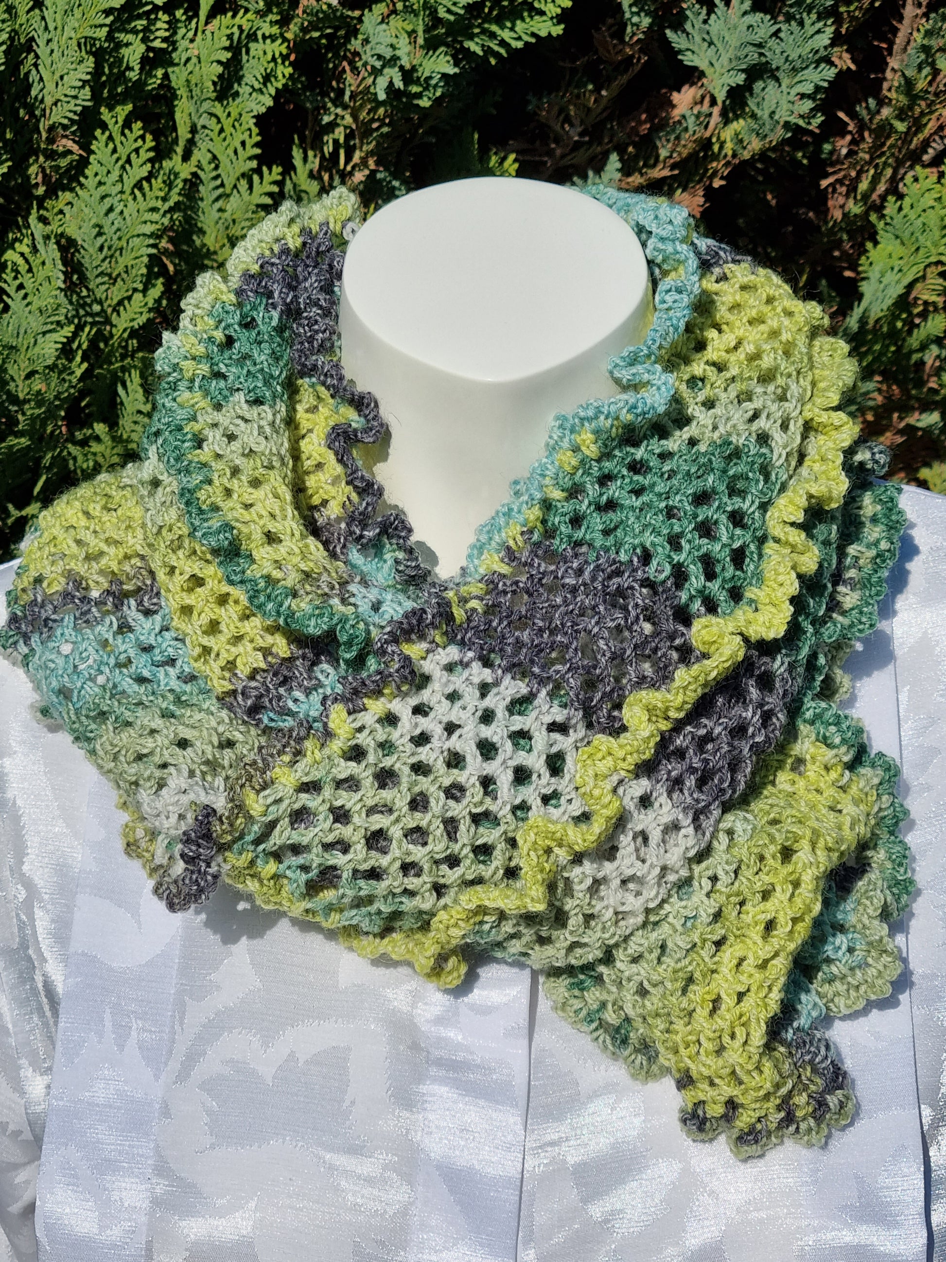 Langer Loop in Grüntönen, handgehäkelt