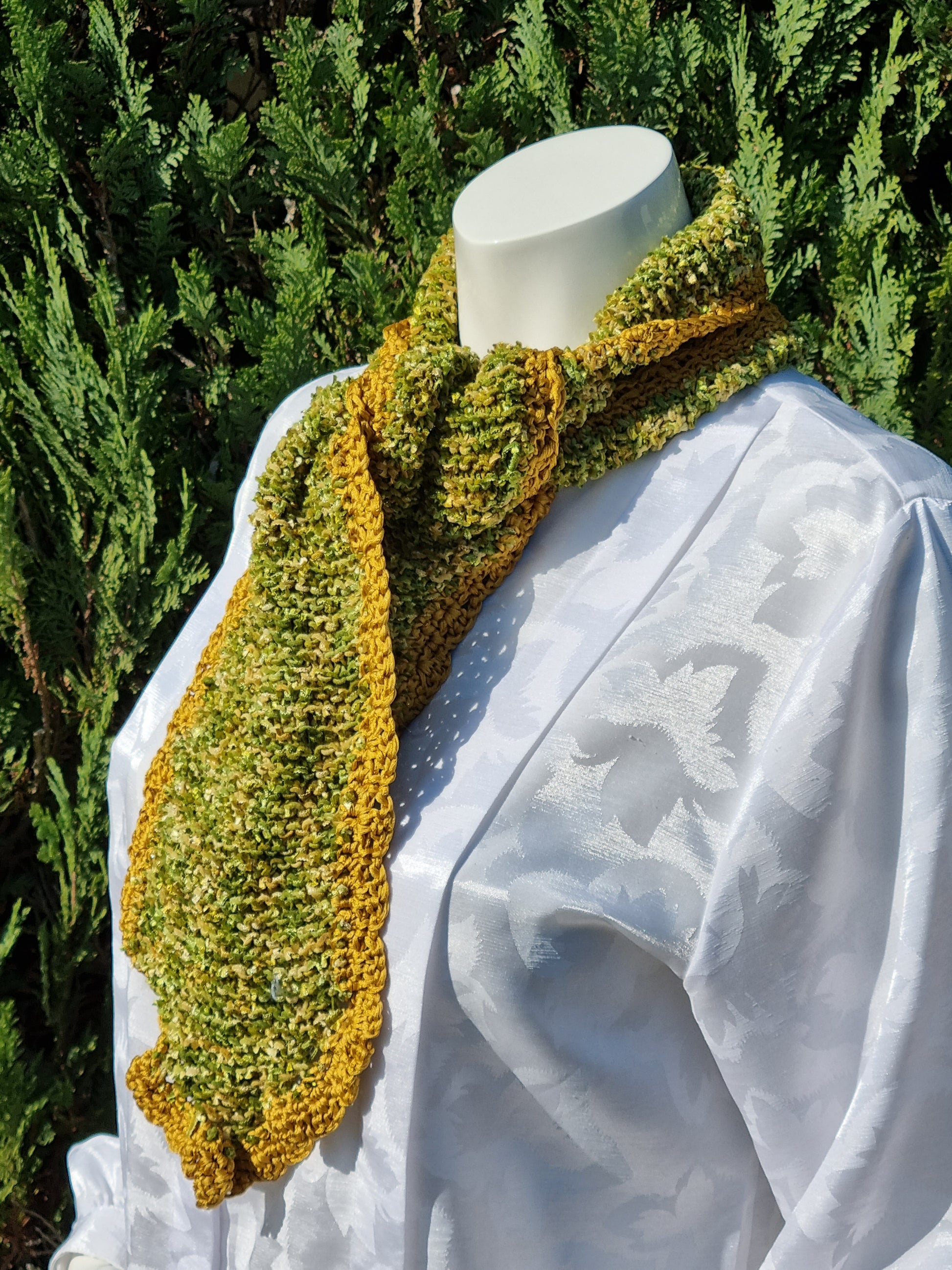 Handgestrickter Schal aus Effekt-Bändchengarn in Grün-Messing-Tönen (Polyamid) mit einer Häkel-Umrandung in Messing, Enden spitz zulaufend