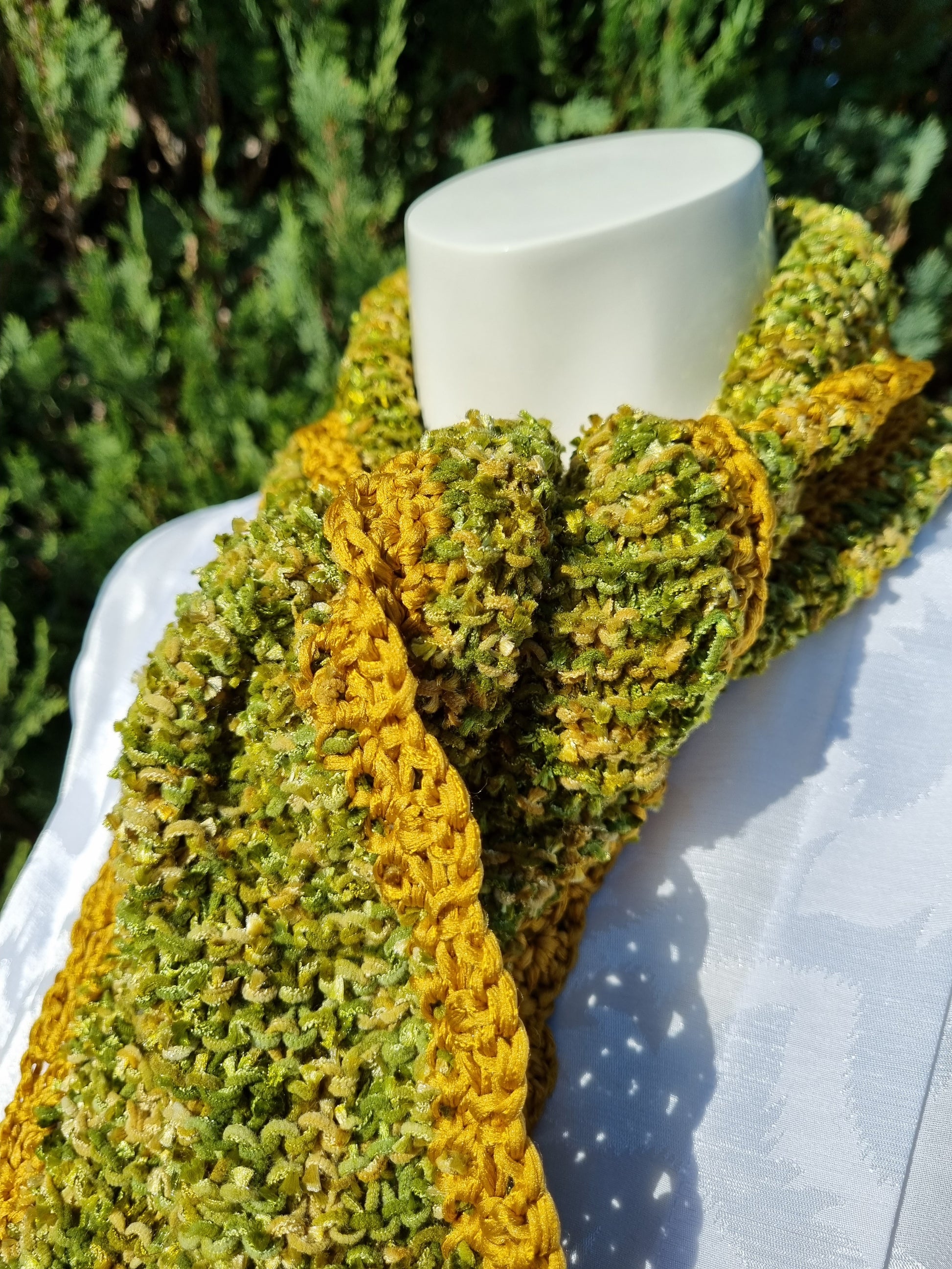 Schal in Grüntönen aus Effekt-Bändchengarn, handgestrickt