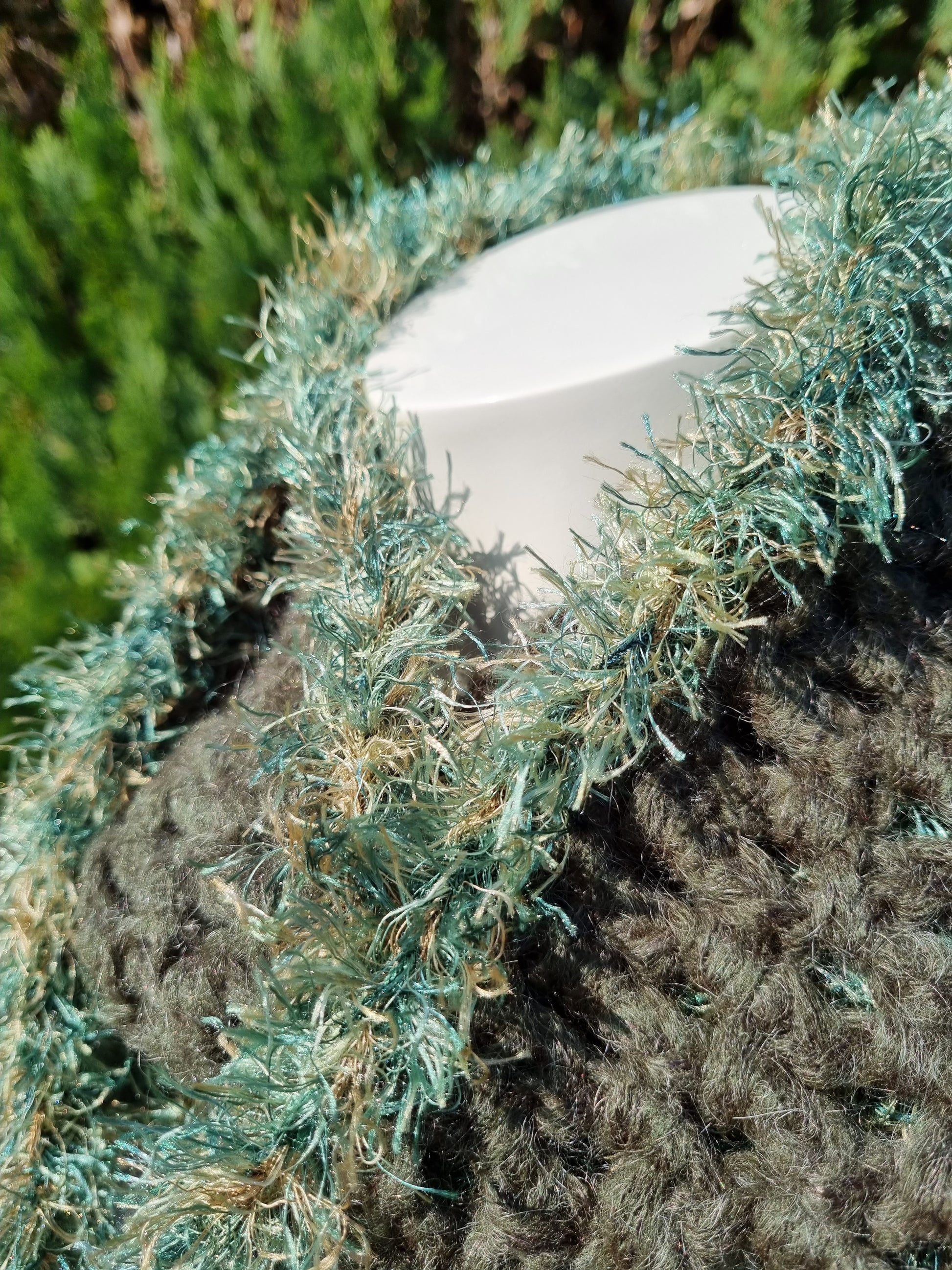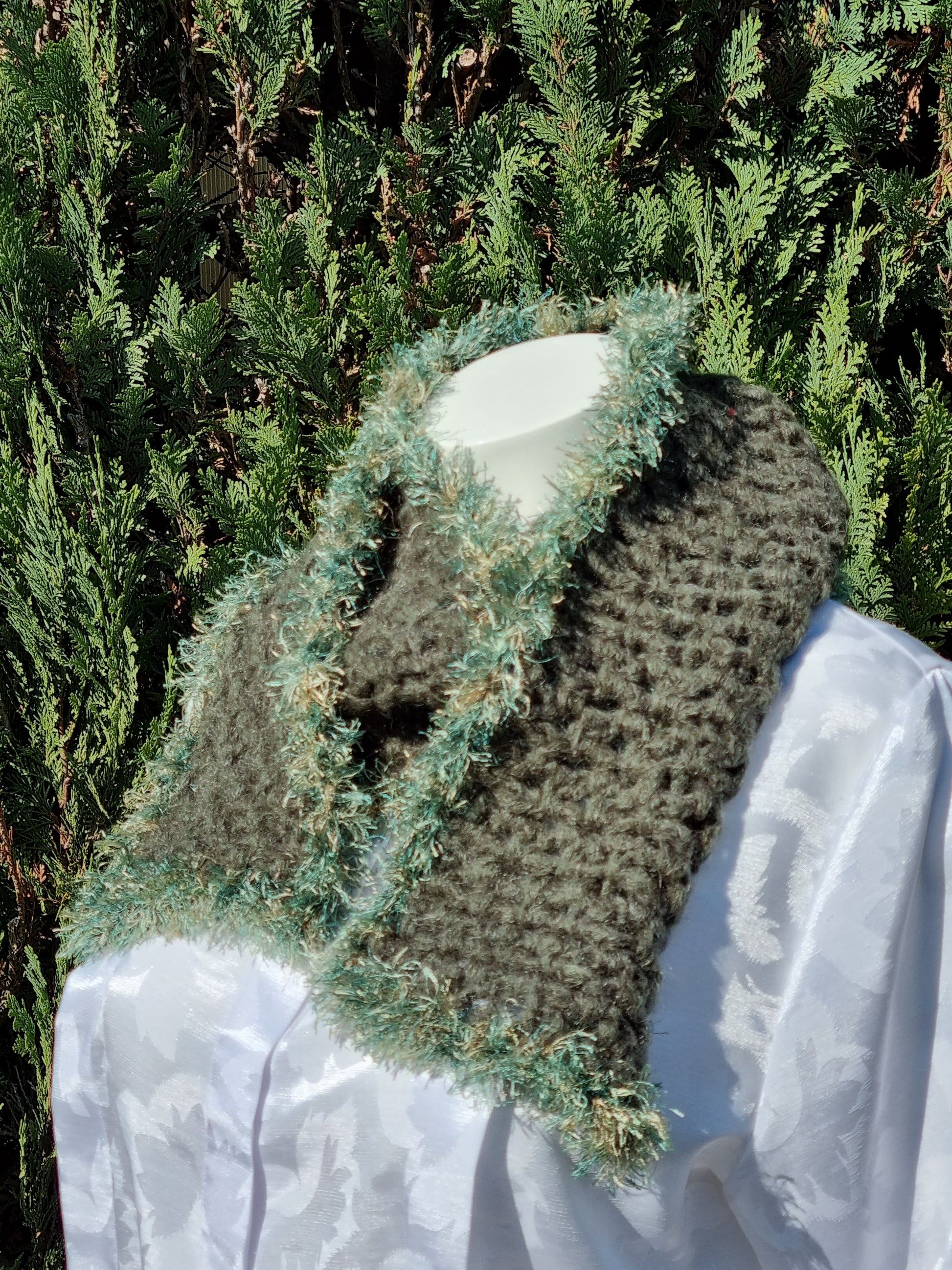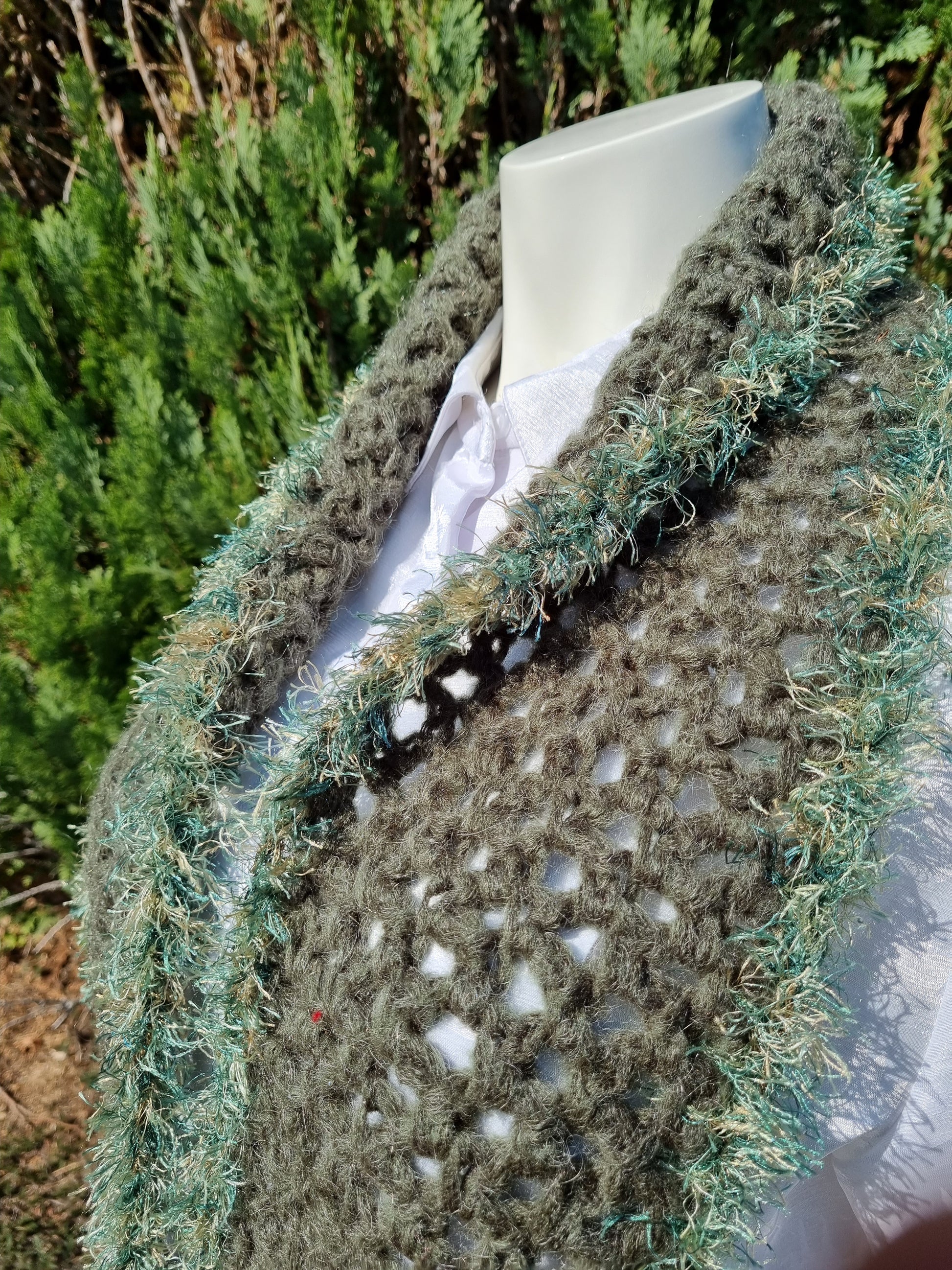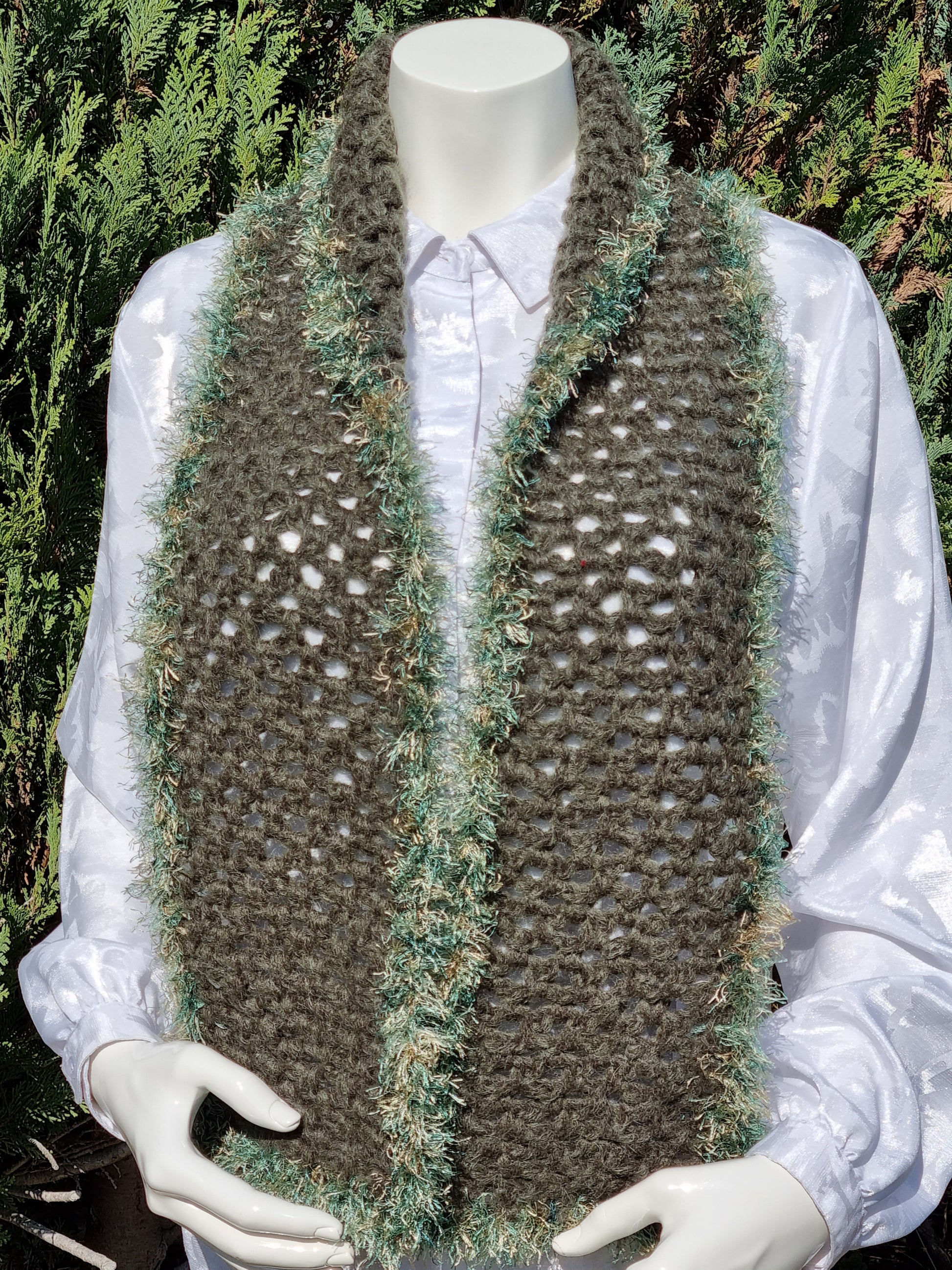 Handgehäkelter Schal aus voluminösem Mohairgarn in Oliv, Netzmuster mit einer Umrandung aus Fancygarn in Grüntönen