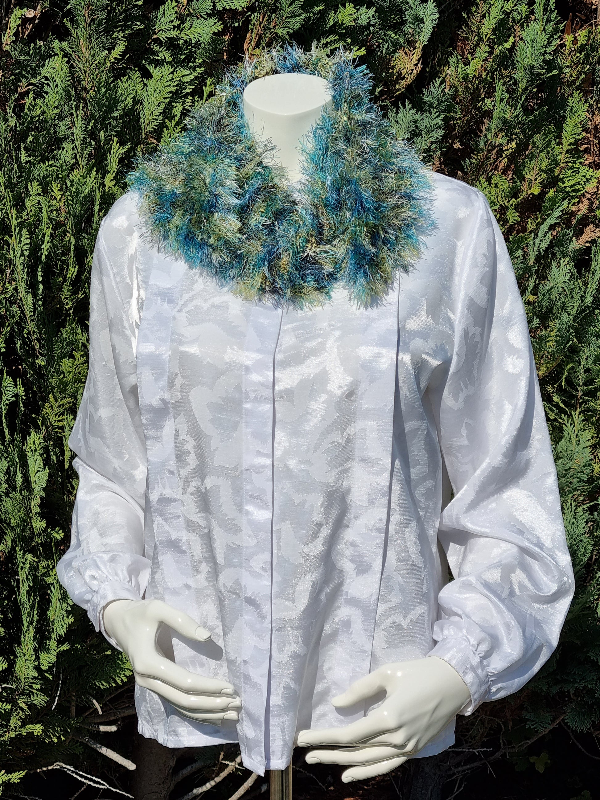 Handgestrickter Schal mit Streifen aus Sockengarn und Fancygarn in Gelb-, Grün-, Blau- und Grautönen, Enden spitz zulaufend