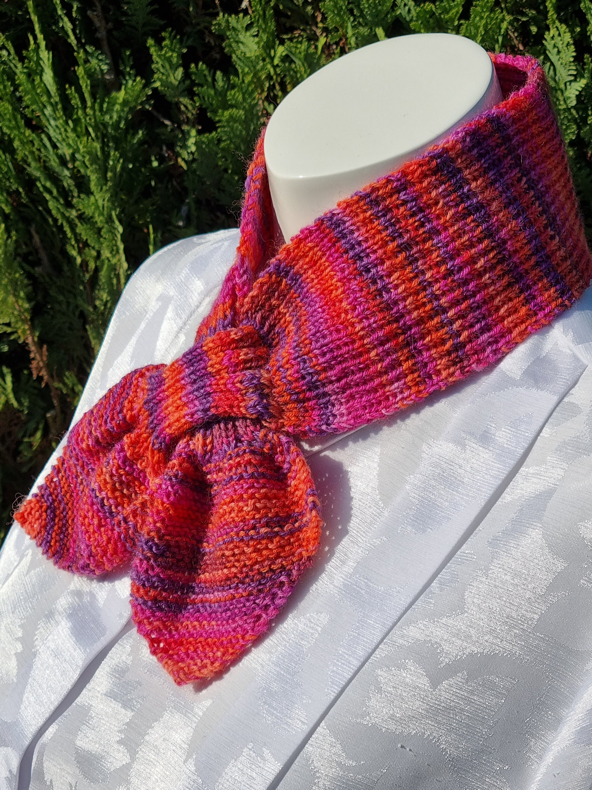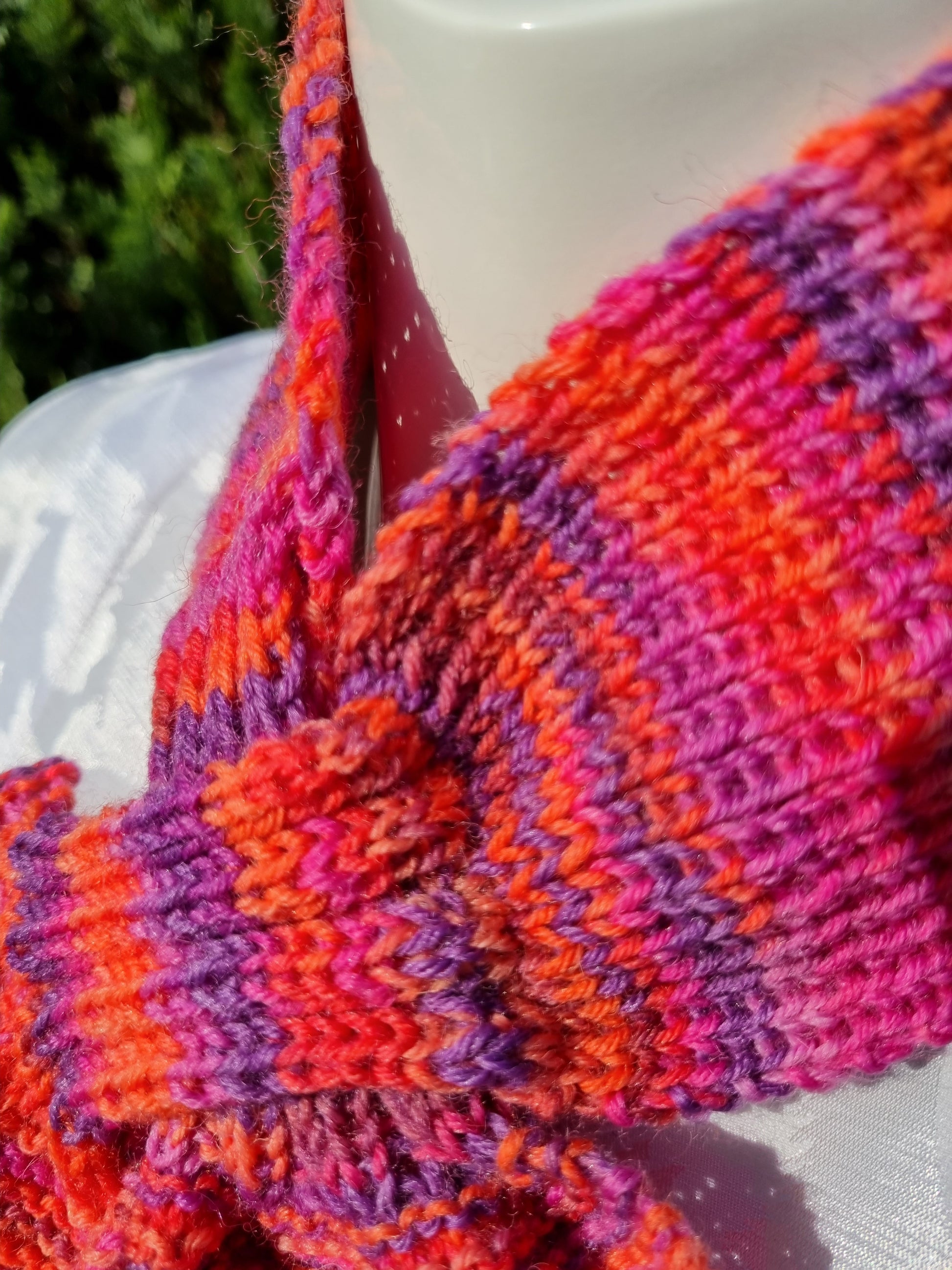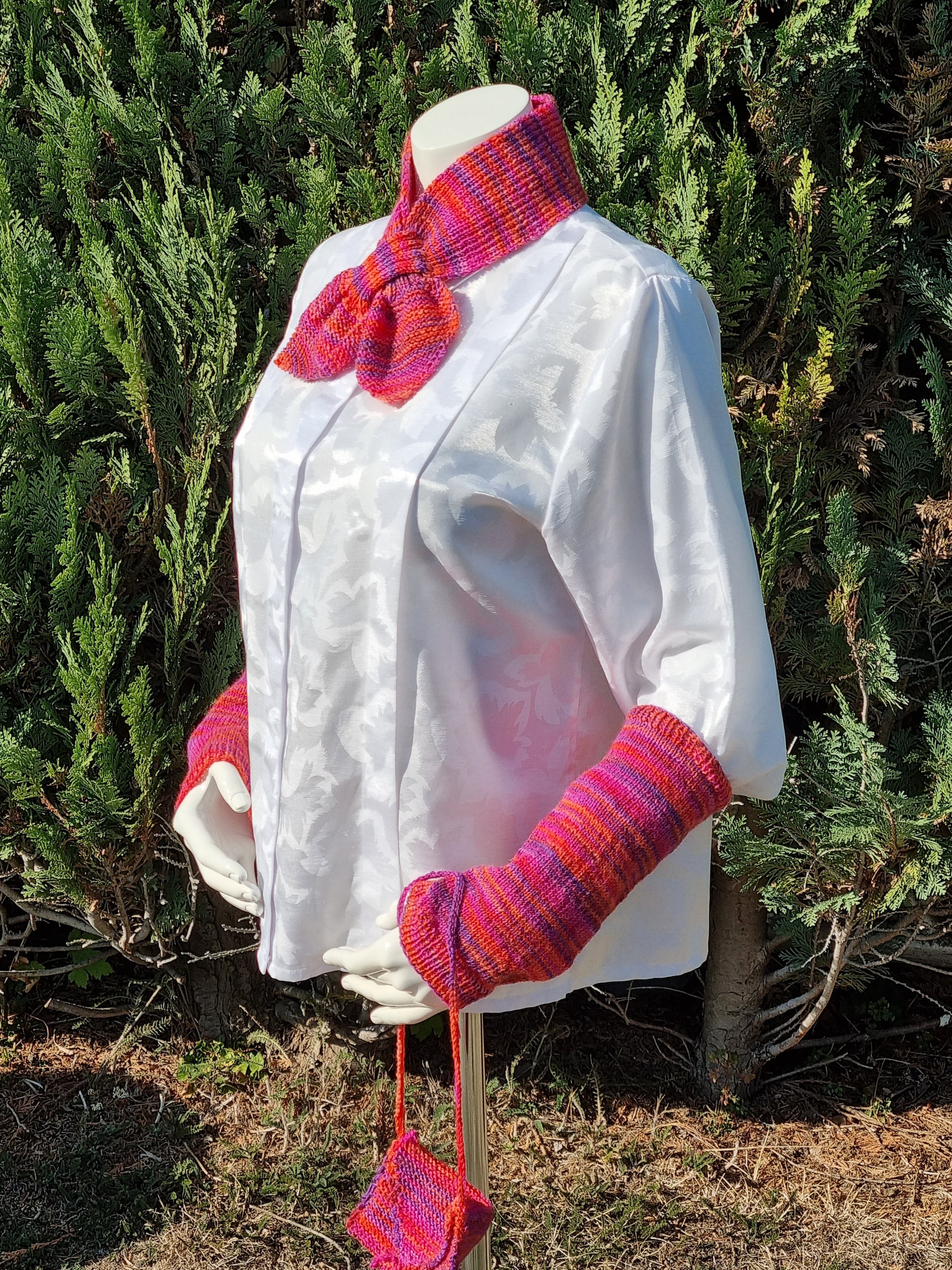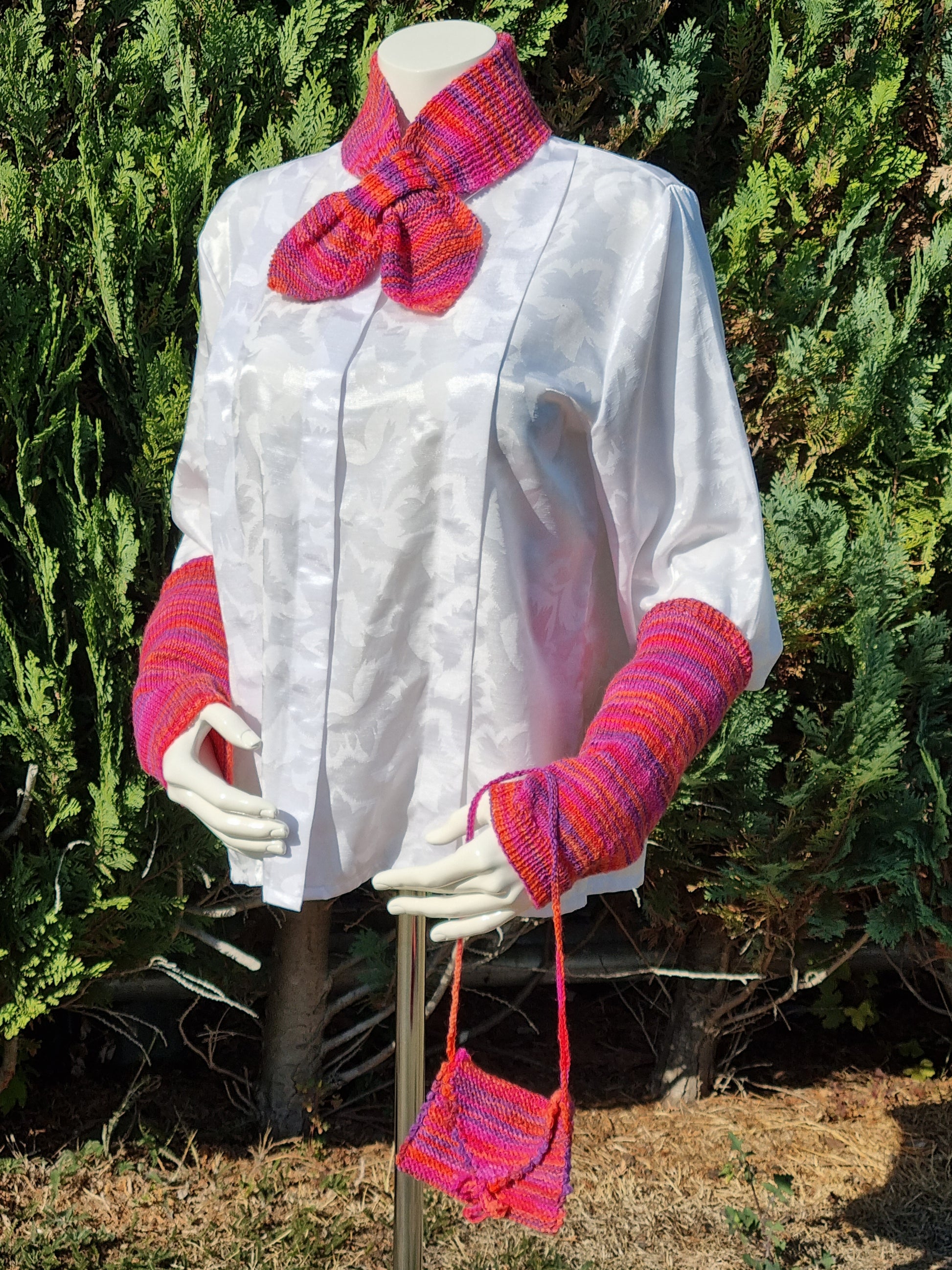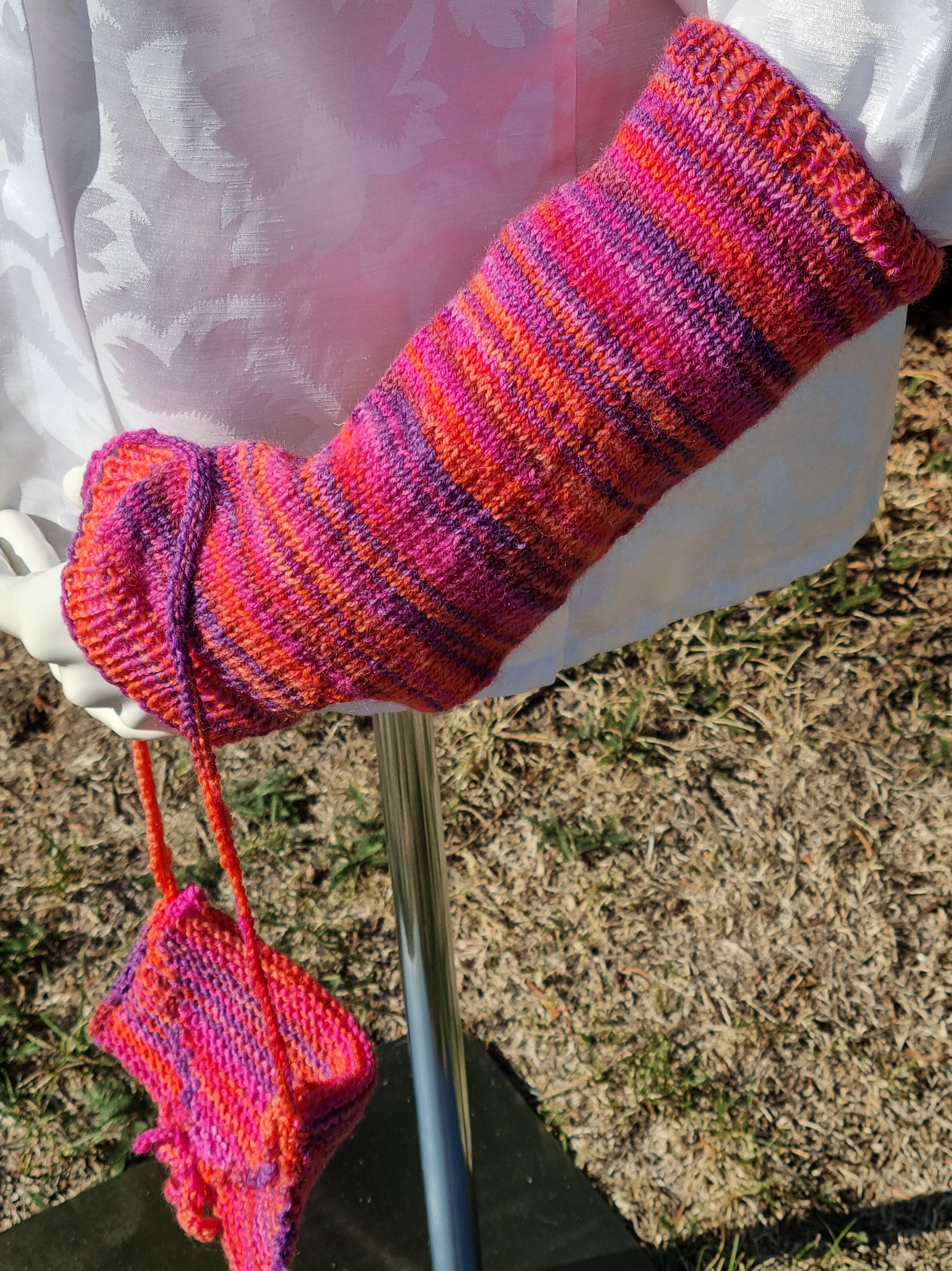 Handgestricktes Set mit Steckschal, Arm-Stulpen und Täschchen aus Qualitäts-Sockenwolle 4-fädig, Pink-/Lila-/Orangetöne